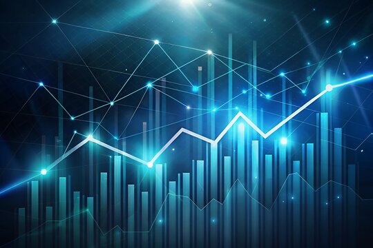 Futuristic financial graph with glowing blue lines and bars on dark background