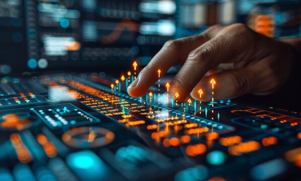 Man interacting with futuristic hologram of rising graph icons on a digital interface