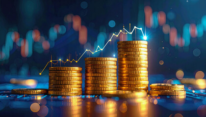 Stack of golden coins with glowing financial graph lines bar chart overlay symbolizing economic