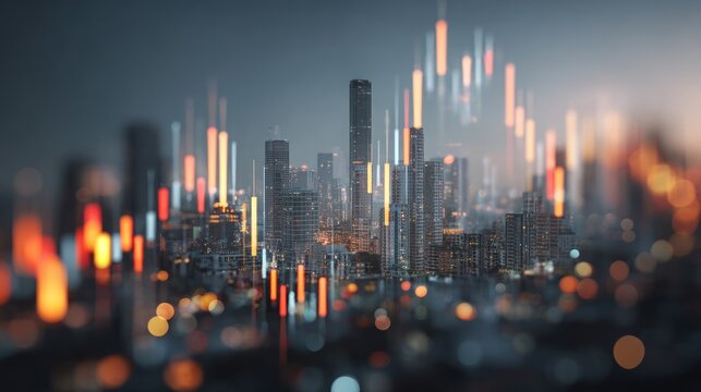 Futuristic cityscape skyline with glowing financial data charts and graphs overlayed, representing economic growth and technological advancement in a modern metropolis at dusk