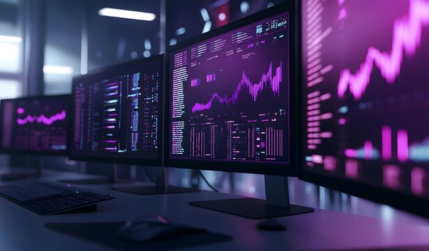 close-up of multiple computer monitors with futuristic and dynamic AI-based data visualizations, charts, graphs, holographic displays showing market trends or financial analytics
