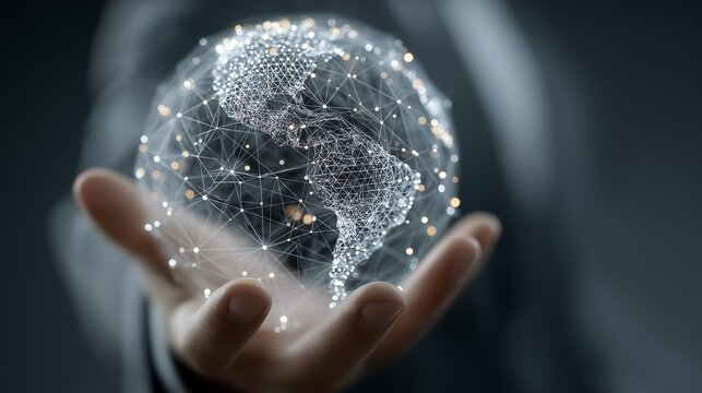 A hand holding a glowing globe surrounded by interconnected lines, symbolizing global connectivity and digital technology.