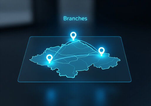 Digital map showing multiple branch locations with interconnected lines, technology, and global networking concepts.