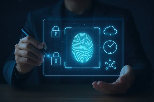 Glowing digital icons of fingerprint and padlock represent biometric security and data protection in a futuristic, tech-driven environment with a dark background