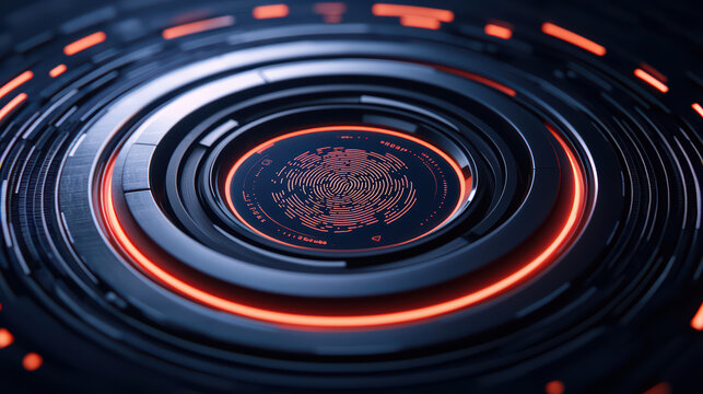 Digital biometric fingerprint design with circular patterns and glowing accents