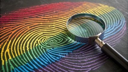 Magnifying glass over fingerprint with digital pattern and colorful design