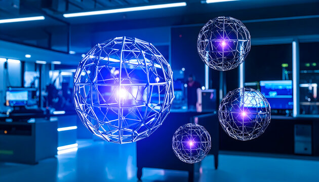 Futuristic Technology Spheres Floating in a High-Tech Laboratory Environment
