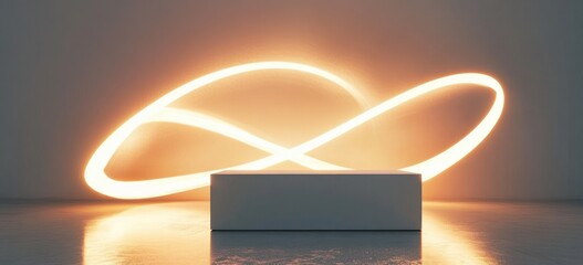 Minimalist gallery scene with a glowing infinity light ribbon looping behind a rectangular pedestal, warm orange glow and reflective floor evoking a serene futuristic mood