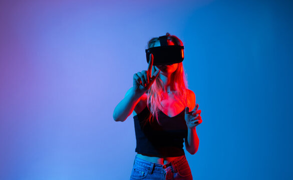 Female navigating virtual reality interface using VR headset and precise hand gesture, neon lighting, metaverse and immersive digital technology concept