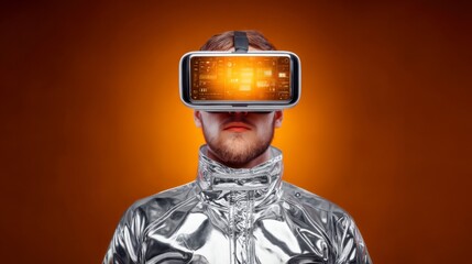 A man wearing a futuristic silver jacket uses a virtual reality headset displaying digital interface elements against an orange background.