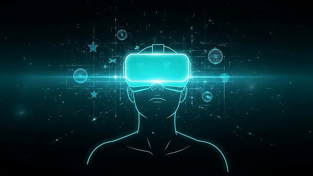 Person wearing futuristic virtual reality headset with glowing blue lines and digital elements