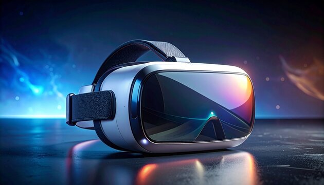 Closeup of a futuristic virtual reality headset with glowing neon lights and digital data streams
