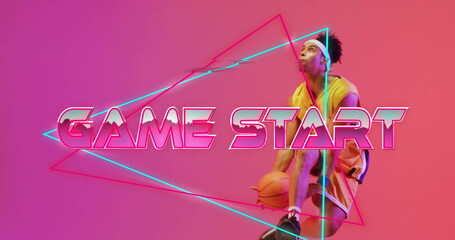 Game Start text image over neon geometric shapes and person in background