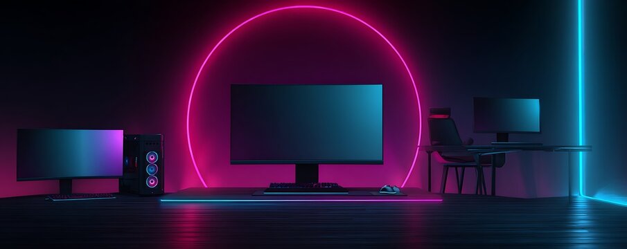 A modern gaming setup featuring sleek screens and neon lighting effects creates an immersive and futuristic atmosphere, perfect for avid gamers and tech enthusiasts.