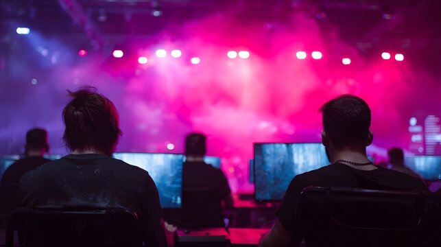 Esports players in a dynamic neon lit arena with smoke effects intensely focused on their gaming monitors during a competition