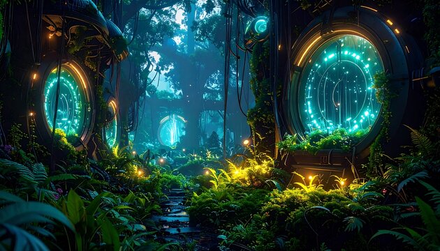 Futuristic Jungle Path with Glowing Portals and Lush Greenery