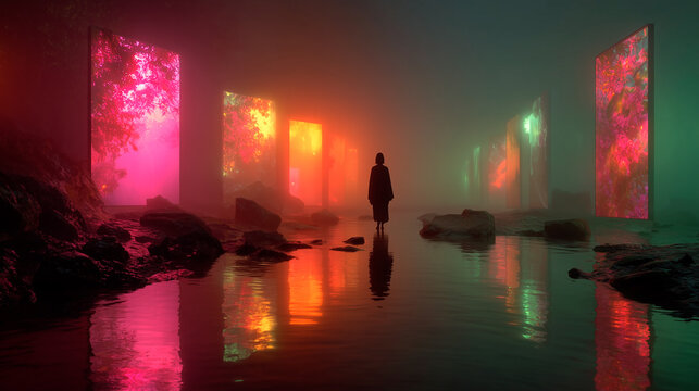 Figure Walking Through Misty AR Installation With Floating Neon Panels And Glitch Overlays On Reflective Water Surface