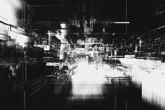 Dynamic abstract monochrome composition features geometric lines and glitch effects creating a