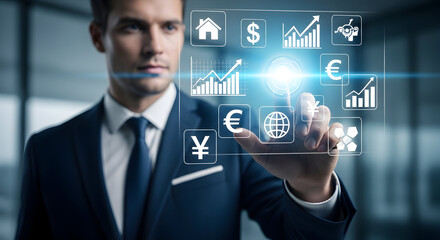 Businessperson Engaging with Digital Finance Icons Representing Banking, Investments, and Currency Management in a Futuristic Interface