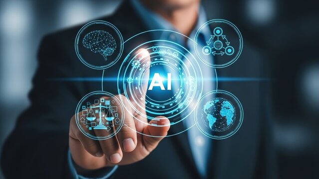 Businessman interacting with a futuristic AI interface, surrounded by icons representing technology, ethics, and global impact.