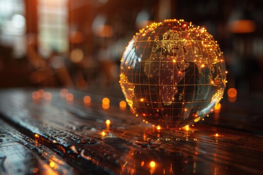 An intricate digital globe casting a warm glow over a circuit board, depicting data flow and technological connectivity