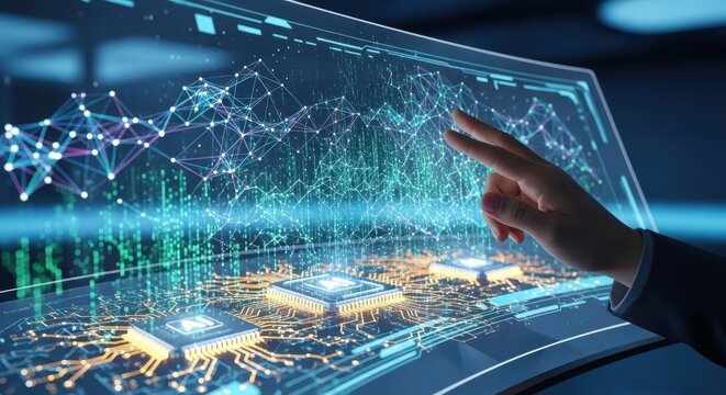 A hand sliding over a futuristic touchscreen displaying a glowing network and AI chips.