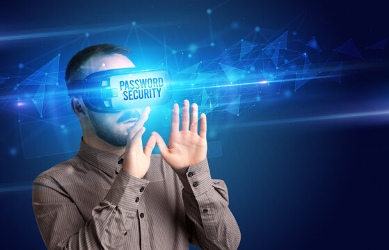 Businessman looking through Virtual Reality glasses, virtual security concept