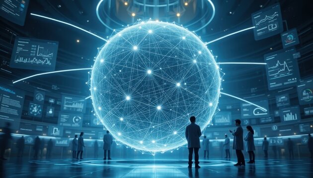Futuristic Global Digital Interface with World Map and Technology Elements