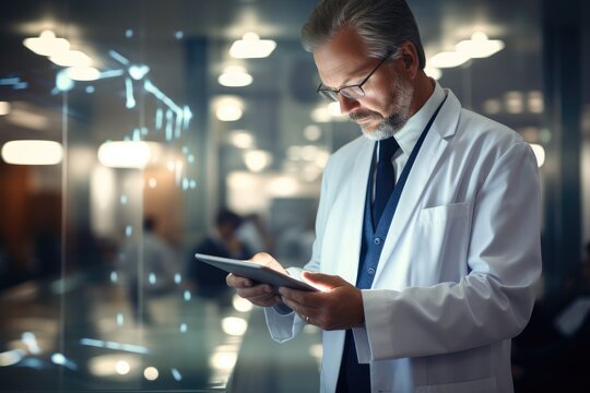 Healthcare and medicine, Medical and technology, Doctor working on digital tablet on hospital background. Generative AI.