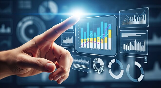 Human finger touching a futuristic holographic display showing financial charts and data analytics