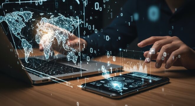 Futuristic global data analytics and digital interface overlay