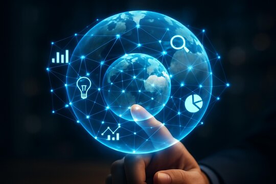 Hand interacting with futuristic glowing holographic globe featuring data visualizations and icons