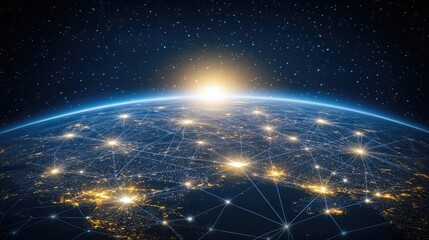 A vibrant display of interconnected lines illustrates global internet connections across the Earth's surface, glowing with blue and white lights under a night sky filled with stars