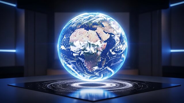 Holographic globe projection dark control room displays detailed map of Earth, showcasing illuminated continents and network connections. futuristic setting evokes sense of advanced technology