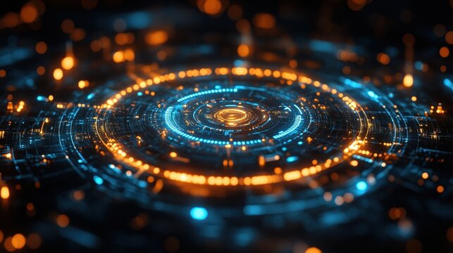 A complex digital interface displaying futuristic circular data visualization patterns, featuring vibrant blue and orange tones, conveying technology and innovation.