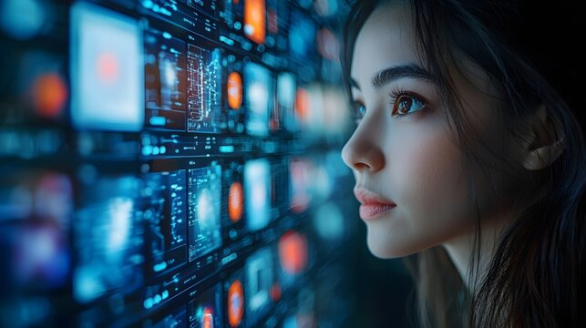 Young woman observes a vibrant digital interface displaying complex data and futuristic networks symbolizing global technological connection and