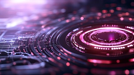 Abstract digital technology background with glowing pink and purple circles and lines.