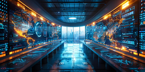 Futuristic digital interface displaying data visualizations, charts, and global information on a screen.