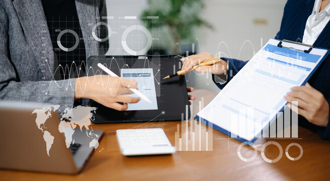 Two businesswomen review financial charts with digital data UI overlays in office. Concept of fintech, big data, global strategy