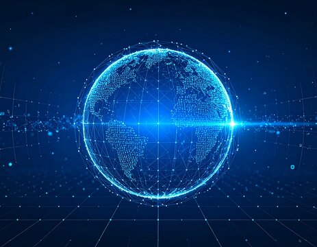 Abstract digital globe with glowing connections and binary code in blue light background.
