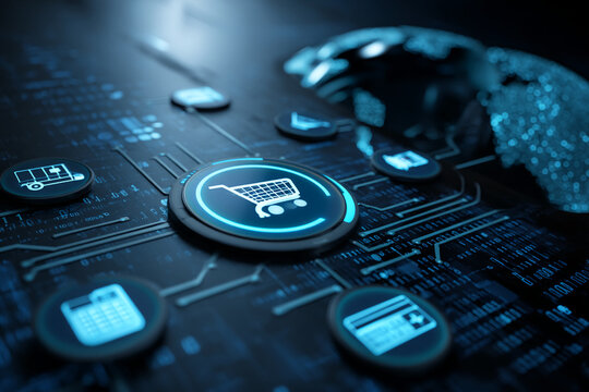 Digital interface showcasing online shopping process,  depicting e-commerce technology and digital transactions, symbolizing modern retail and technological advancement