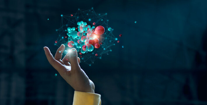 A futuristic hand holds a glowing globe, surrounded by digital icons representing technology, data, and global connectivity.