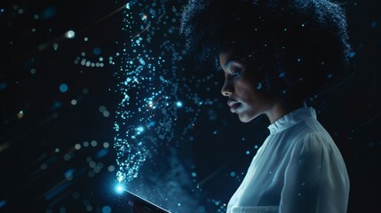 Woman using futuristic social network app with tablet hologram displaying global user data and analytics. Mobile technology, ux/ui, and business concept. African american female with web internet, soc