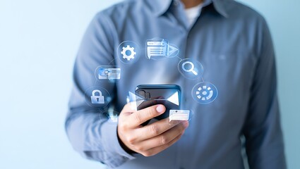Business executive interacting with advanced blockchain interface - Global data connectivity and cybersecurity visualization