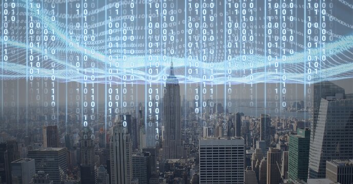 Composition of digital interface over a cityscape with blue waes in the sky in background