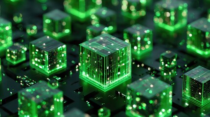 Abstract glowing green digital cubes with intricate circuit patterns create a modern, futuristic concept for technology and data.