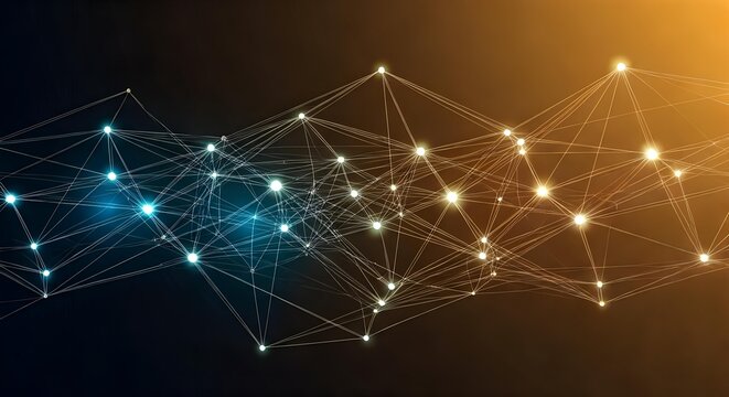 Abstract Blue Tech Network Grid With Orange Polygonal Points and Glowing Links On A Dark Blurred Background
