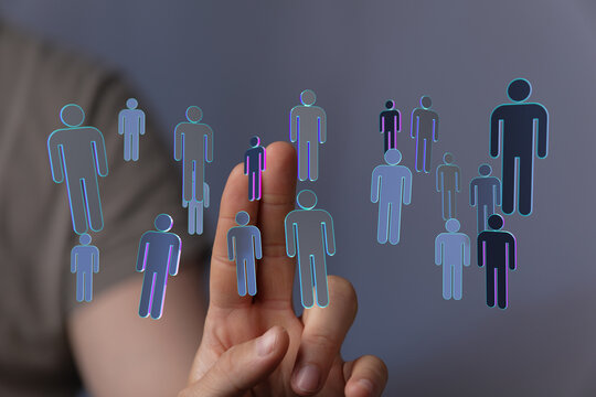 Abstract network of people with hand touching interface on futuristic background, concept of communication, con