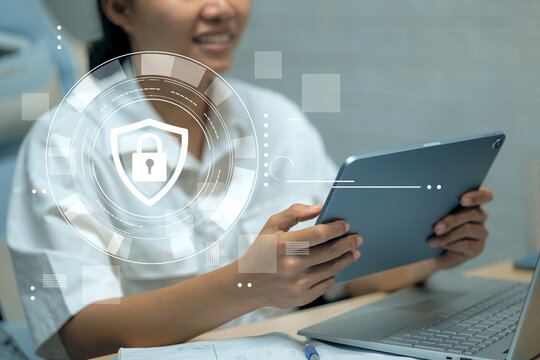 Protective shield and padlock graphic overlay on a person using a laptop