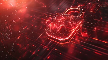 High-tech padlock with dynamic characters overlay, illustrating secure connections, intense red details,